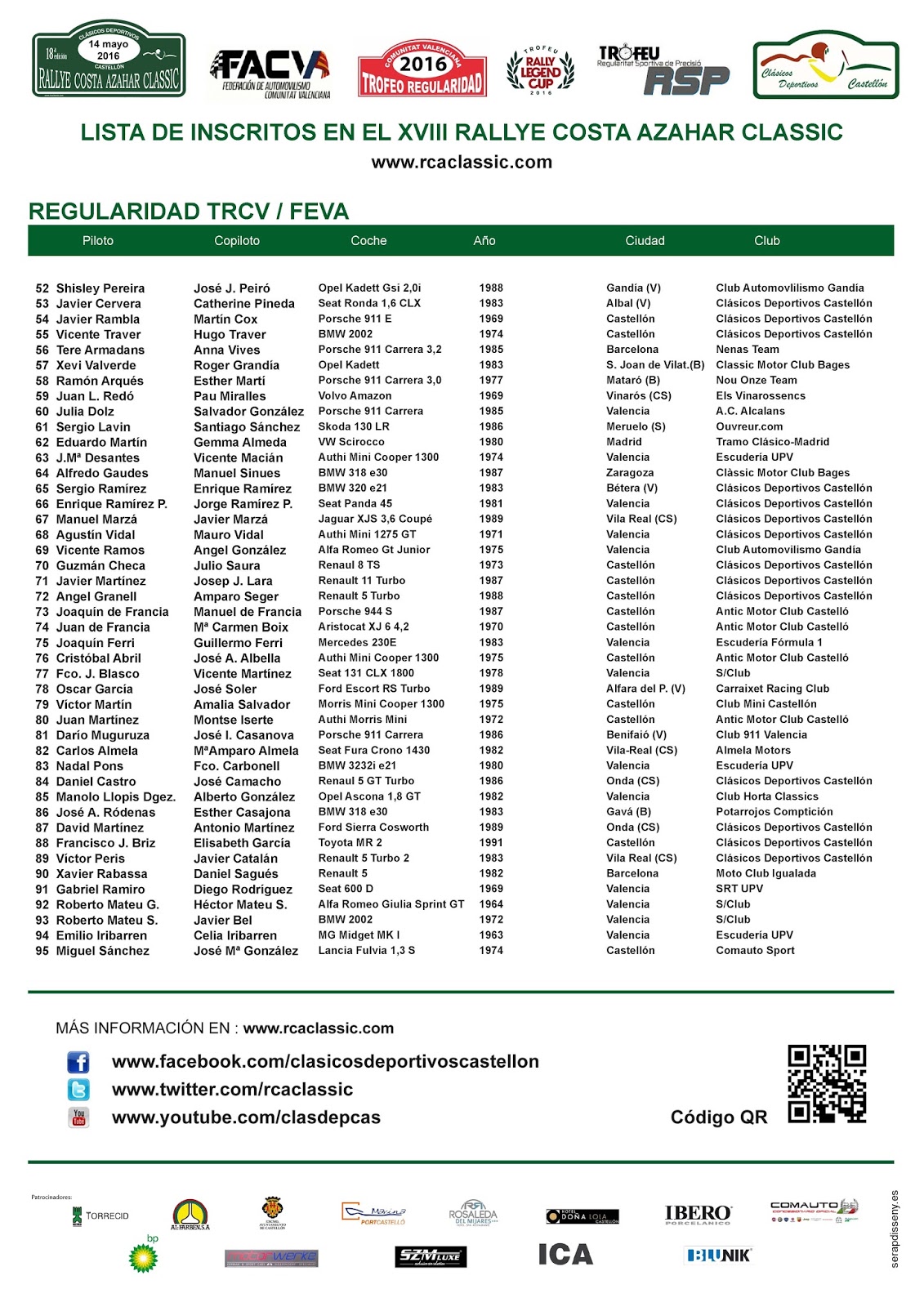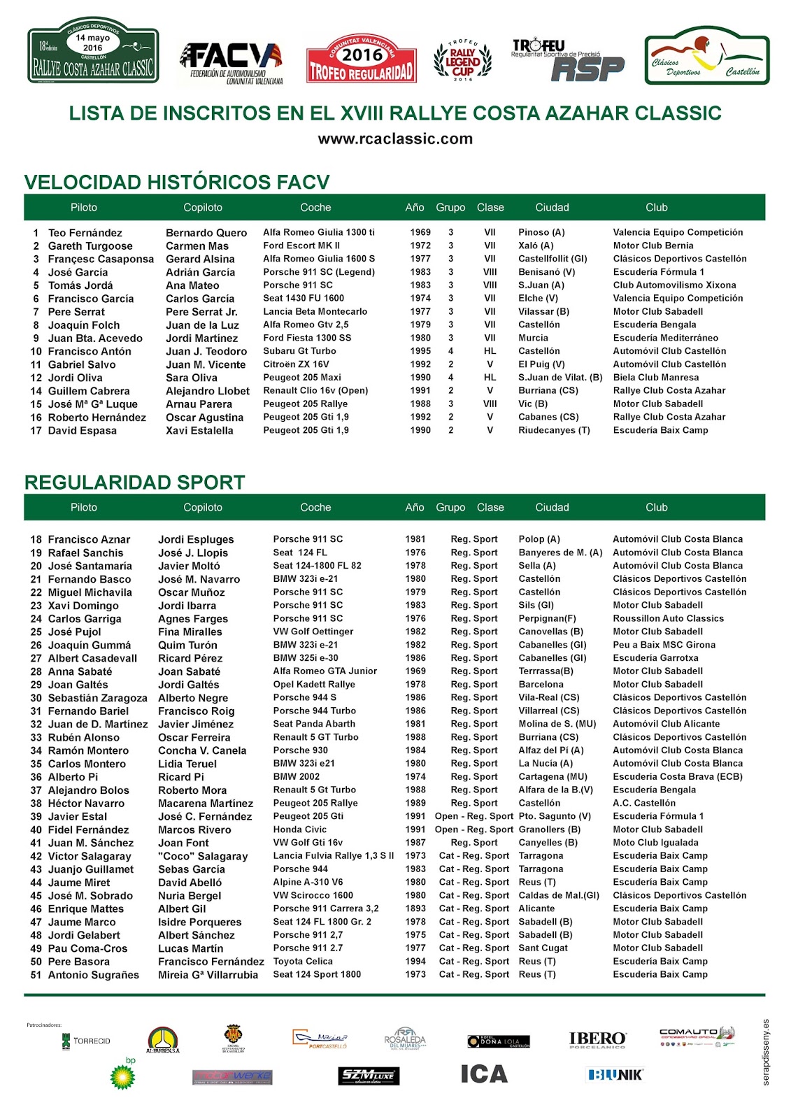 Desde la directiva de Clásicos Deportivos Castellón, queremos dar las gracias a los patrocinadores de esta 18ª edición del Rallye Costa Azahar Classic. Sin su apoyo incondicional durante estos años, no podríamos haber mantenido este proyecto.